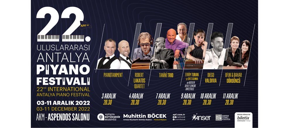 2000 yılından bu yana Antalya'nın uluslararası "Sanat Şehri" kimliğine katkıda bulunan, Avrupa Festivaller Birliği (EFA) üyesi Uluslararası Antalya Piyano Festivali bu yıl 3 -11 Aralık tarihleri arasında yapılacak. Antalya Büyükşehir Belediyesi’nin ev sahipliğinde 22‘ncisi gerçekleşecek olan festival, dünyaca ünlü sanatçıları Antalya‘da müzikseverlerle buluşturacak.