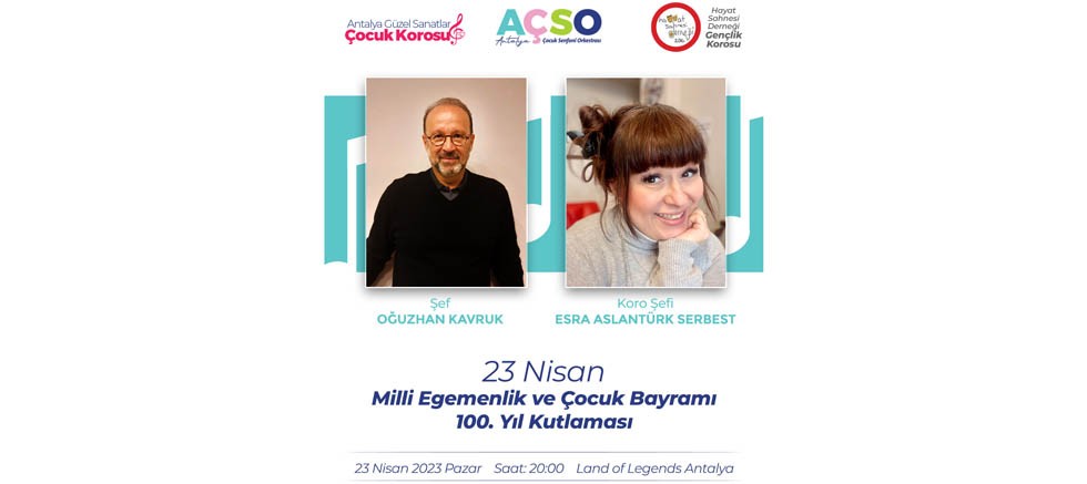 23 Nisan 2023 Pazar günü saat 20:00'de Antalya, Serik, Land of Legends Otel'de yapılacak olan 100. Yıl Çocuk Festivali'nde Cumhurbaṣkanlığı Devlet Senfoni Orkestrası Sanatçısı,Antalya Devlet Senfoni Orkestra ṣefi Oğuzhan Kavruk'un kurduğu AÇSO ,Antalya Çocuk Senfoni Orkestrası sahne alıyor. AÇSO'nın Ṣefi Oğuzhan Kavruk ,Antalya Güzel Sanatlar Çocuk Korosu ve Hayat Sahnesi Derneği Gençlik Korosu Ṣefi Esra Aslantürk Serbest ve Öğrencileriyle oluṣturduğu projesinde ,dinleyicilere unutulmaz bir program sunuyor.75 çocuk ve genç mūzisyenin sahne aldığı hazırladıkları 100.yıl özel programına herkes davetli olup, katılım ücretsizdir.