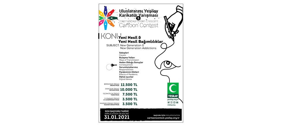 Yeşilay, bağımlılığın etkilerini yaratıcı bir dille gündeme getiren Uluslararası Yeşilay Karikatür Yarışması’nın 5’inci kez düzenliyor. Yarışmaya katılan eserlerden bu sene “Yeni Nesil ve Yeni Nesil Bağımlılıklar” ana teması altında bu bağımlılıkların sebepleri, bulaşma yolları, neden olduğu sonuçlar, sorumluluklar ile pandeminin etkileri ve dijital oyunlar başlıklarında; online bahis ve online kumar bağımlılıklarına odaklanmaları bekleniyor. Dünyadan ve Türkiye’den profesyonel ve amatör tüm karikatüristlerin katılımına açık yarışmanın başvuruları 31 Ocak 2021 tarihine kadar cartooncontest.yesilay.com.tr adresinden yapılabiliyor.