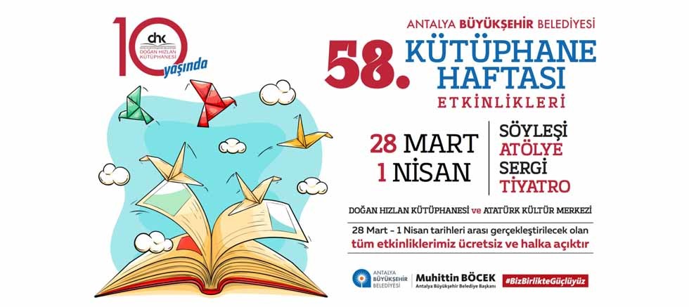 Antalya Büyükşehir Belediyesi Kütüphane Haftası’nı 28 Mart -1 Nisan tarihleri arasında sürecek bir dizi etkinlikle kutlamaya hazırlanıyor. Etkinlikler kapsamında Büyükşehir Belediyesi’ne bağlı Doğan Hızlan Kütüphanesi’nin 10. Yılı da kutlanacak.