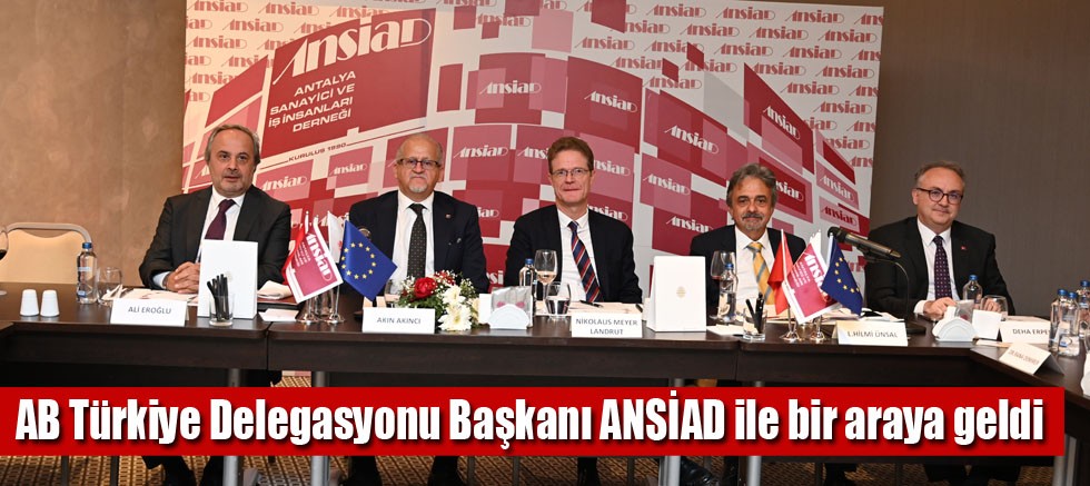 Antalya Sanayici ve İş İnsanları Derneği (ANSİAD), Avrupa Birliği Türkiye Delegasyonu Başkanı Büyükelçi Nikolaus Meyer-Landrut’u konuk etti. Avrupa Birliği Türkiye Delegasyonu Başkanı Büyükelçi Nikolaus Mayer- Landrut ve beraberindeki heyet, ANSİAD Başkanı Akın Akıncı, Uluslararası İlişkiler ve AB Çalışma Masası Başkanı Hilmi Ünsal, masa paydaşları ve üyeleri ile bir araya gelerek iş ve iklim değişikliği adaptasyonu konusunda toplantı gerçekleştirdi. Toplantı başkanlığını ANSİAD Uluslararası İlişkiler & AB Çalışma Masası Başkanı Hilmi Ünsal’ın gerçekleştirdiği yemeğe, Büyükelçi & Dışişleri Bakanlığı Antalya Temsilcisi Deha Erpek, Delegasyon Başkanı Eşi Brigitte Meyer-Landrut, Büyükşehir Belediyesi Uluslararası İlişkiler Daire Başkanı Tuğçe Çiftçibaşı Güç, Antalya Ticaret ve Sanayi Odası (ATSO) AB Bilgi Merkezi Koordinatörü İsmail Tuna Aras, AB Bakanlığı AB İşleri Uzmanı Selman Çetin, ANSİAD Yüksek Danışma Kurulu Başkanı & TÜRKONFED Başkan Yardımcısı Ali Eroğlu, ANSİAD Geçmiş Dönem Başkanları Mehmet Hacıarifoğlu & Bekir Bülend Özsoy, ANSİAD Geçmiş Dönem Başkanı & ANSİAD Ekonomik ve Sektörel Gelişme Çalışma Masası Başkanı Ergin Civan, ANSİAD İklim Değişikliği ve Sürdürülebilir Çevre Çalışma Masası Başkanı Cem Arüv, Akdeniz Üniversitesi İİBF Öğretim Üyesi Doç. Dr. Şükrü Erdem, masa paydaşları ve ANSİAD üyesi iş insanları katıldı.