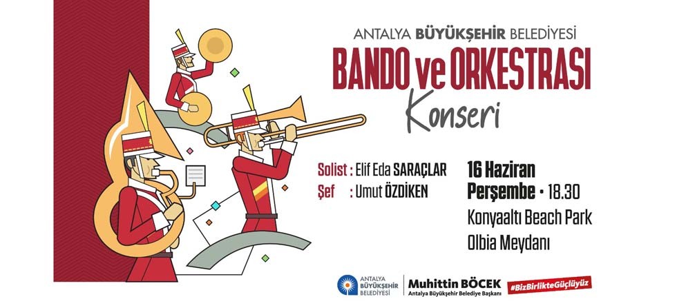 Antalya Büyükşehir Belediyesi Bando ve Orkestrası 16 Haziran Perşembe günü saat 18.30’da Konyaaltı Sahili Olbia Meydanı, 21 Haziran Salı saat 18.00’de Kemer Cumhuriyet Meydanı ve 24 Haziran Cuma saat 18.00’de Konyaaltı Sahili Sea Life Otel karşısında konser verecek.