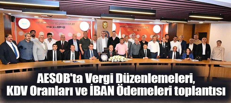 Antalya Esnaf ve Sanatkarlar Odaları Birliği'nde Antalya Vergi Dairesi Başkanı İlhan Karayılan ve Vergi Dairesi Müdürlerinin katılımlarıyla AESOB Başkanı Adlıhan Dere başkanlığında Yeme - İçme Sektörüne ilişkin Vergi Düzenlemeleri, KDV oranları ve IBAN ödemeleri hususunda toplantı gerçekleştirildi.