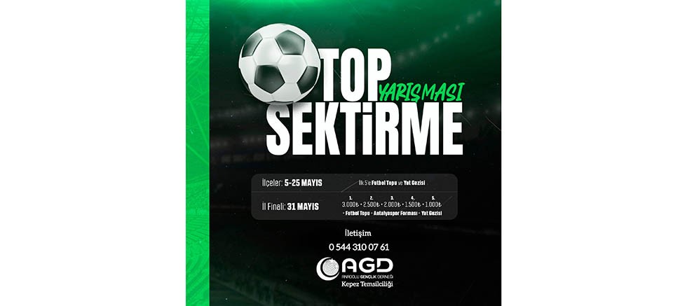 Anadolu Gençlik Derneği (AGD) Antalya Şubesi tarafından il genelinde organize edilen “Top Sektirme Yarışması” büyük bir coşku ile başladı. 5-25 Mayıs tarihleri arasında Antalya'nın çeşitli ilçelerinde düzenlenecek olan ön eleme yarışmalarına AGD Kepez İlçe Temsilciliği olarak güçlü bir destek veriyoruz.