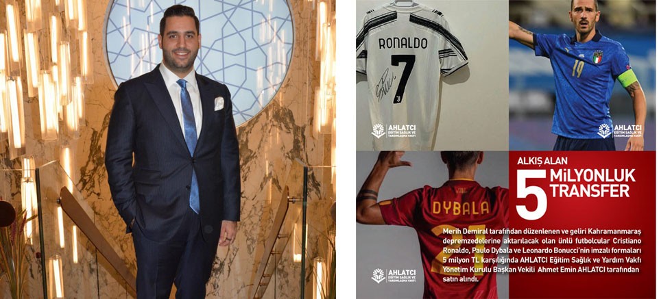 İtalyan ekibi Atalanta'da forma giyen Merih Demiral tarafından düzenlenen ve geliri Kahramanmaraş depremzedelerine aktarılacak olan, ünlü futbolcular Cristiano Ronaldo, Paulo Dybala ve Leonardo Bonucci’nin imzalı formaları 5 milyon TL karşılığında AHLATCI Eğitim Sağlık ve Yardım Vakfı Yönetim Kurulu Başkan Vekili Ahmet Emin AHLATCI tarafından satın alındı.