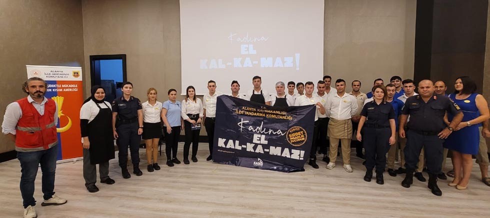 "Antalya İl Jandarma Komutanlığı Alanya İlçe Jandarma Komutanlığına bağlı Aile İçi Şiddetle Mücadele ve Çocuk Kısım Amirliği tarafından faaliyet yürüten turizm işletmesinde çalışan kadın ve erkek personellere *"Kadına El Kalkamaz"* mottosu altında 5 milyon erkeğe eğitim verilmesi projesi ve Kadına Yönelik Şiddetle Mücadele İl Eylem Planı kapsamında aile içi şiddet, şiddetin tanımı, çeşitleri, etkileri, sonuçları ve kanunî yaptırımları ile KADES uygulaması konularında bilgilendirme faaliyeti icra edilmiştir.