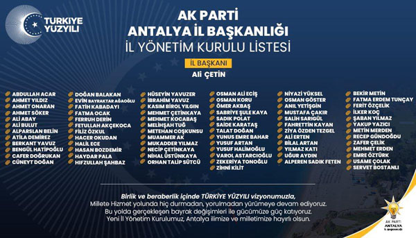 *AK Parti Antalya İl Teşkilatında İl Yönetim Kurulu ve İl Yürütme Kurulu Üyeleri ekteki görsellerde yer almaktadır.