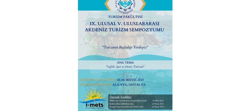 IX. ULUSAL V. ULUSLARARASI Akdeniz Turizm Sempozyumu (I-METS), Alanya Alaaddin Keykubat Üniversitesi Turizm Fakültesi tarafından 04- 06 Mayıs 2023 tarihleri arasında Alanya’da Kaila Beach Hotel’de Türkiye’deki bölgesel paydaşların desteğiyle düzenlenecek. Sempozyumun temel amacı, bilimsel makaleler sunarak ve uluslararası turizmde güncel konuları tartışarak bölgenin ve Alanya'nın turizm gelişimine katkı sağlamaktır. Sempozyumda dünyaca ünlü akademisyenler tarafından bilimsel konuşmalar ve araştırma yöntemleri workshopları gerçekleştirilecektir. Akademisyenleri ve turizm sektör profesyonellerini 04- 06 Mayıs tarihlerinde Turizmin başladığı yer olan Alanya’ya davet ediyoruz.