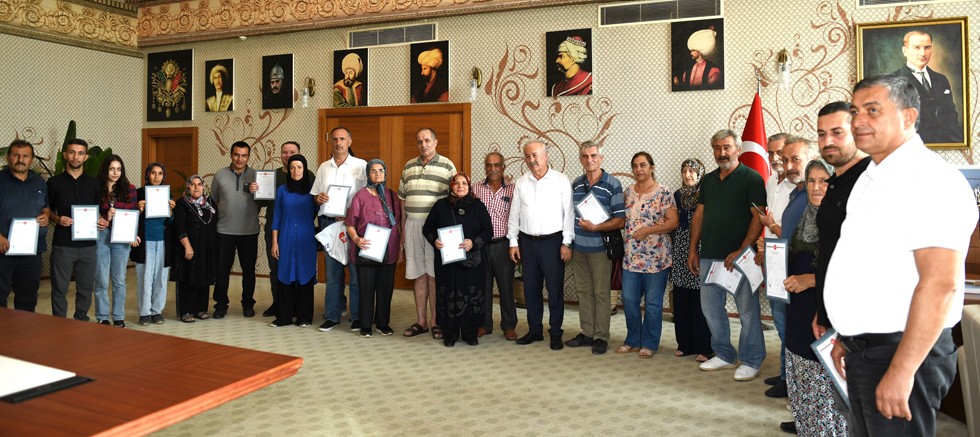 Pınarlı, Cihadiye, Çamköy Mahallelerindeki hak sahiplerini tapularına kavuşturan Aksu Belediyesi bu hafta da 19 kişiye tapusunu verdi. Hak sahipleri Belediye Başkanı Halil Şahin’in makamında bir araya gelerek tapularını almanın mutluluğunu yaşadı.