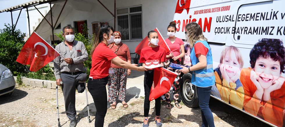 Sabah saatlerinden itibaren 23 Nisan süslemeleri ile giydirilmiş ve 23 Nisan şarkıları çalan bir araç Aksu sokaklarında çocukların bayramını kutladı. Aksu Vefa Sosyal Destek Grubu ekipleri araçla mahalle mahalle dolaşarak çocuklara bayrak dağıttı.
