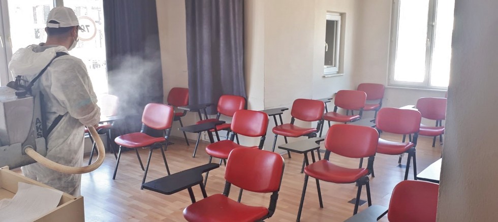 Aksu Belediyesi Temizlik İşleri Müdürlüğüne bağlı ekipler normalleşme sürecinin ardından yeniden hizmet vermeye başlayan restoran, kahvehane ve sürücü kurslarını dezenfekte etmeye devam ediyor.