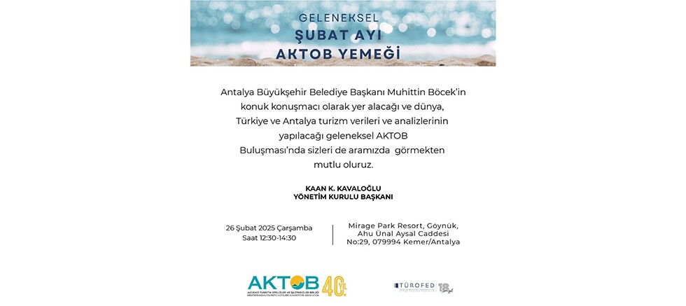 AKTOB Başkanı Kaan Kavaloğlu etkinliğe ilişkin yaptığı değerlendirmede; "AKTOB olarak kurumlar arası işbirliği ve sektörümüzle bu kurumlar arasında köprü olma yönünde çalışmalar yürütüyoruz. Yerel yönetimlerin turizm sektörünün gelişmesindeki rolü çok büyük, altyapı, kültür, ekonomi ve çevre politikalarını bütüncül bir yaklaşımla ele alarak, turizmin sürdürülebilir ve dengeli bir şekilde büyümesine olanak tanıyor. Dünyanın en fazla ziyaret edilen ilk 5 şehri arasında yer alan Antalya'mızın, kentsel altyapısı ve çevre düzenlemesi gibi büyük ve güç çalışmalar üstlenen Büyükşehir Belediyemizin Başkanı Muhittin Böcek aramızda bulunacak ve Antalya'da yapılan ve yapılacak hizmetlere ilişkin konuşma gerçekleştirecek. Ayrıca dünya, Türkiye ve Antalya turizm verileri ve analizlerini ele alacağımız yemekli buluşmada, tüm üye ve paydaşlarımızı aramızda görmeyi bekliyoruz." dedi.