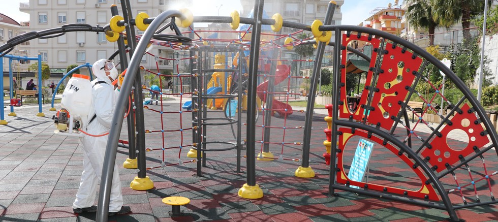 Alanya Belediyesi Park ve Bahçeler Müdürlüğü, çocukların daha sağlıklı ve hijyenik ortamlarda eğlenerek vakit geçirebilmeleri amacıyla 3 ay önce başlattığı dezenfekte çalışmalarına aralıksız devam ediyor.
