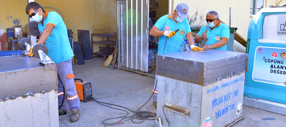 Alanya Belediyesi Temizlik İşleri Müdürlüğü ekipleri, kent genelinde eskiyen, yıpranan ve işlevini kaybetmeye yüz tutan çöp konteynerlerini tamir ederek çöpten geri dönüşümden tasarruf sağlıyor.
