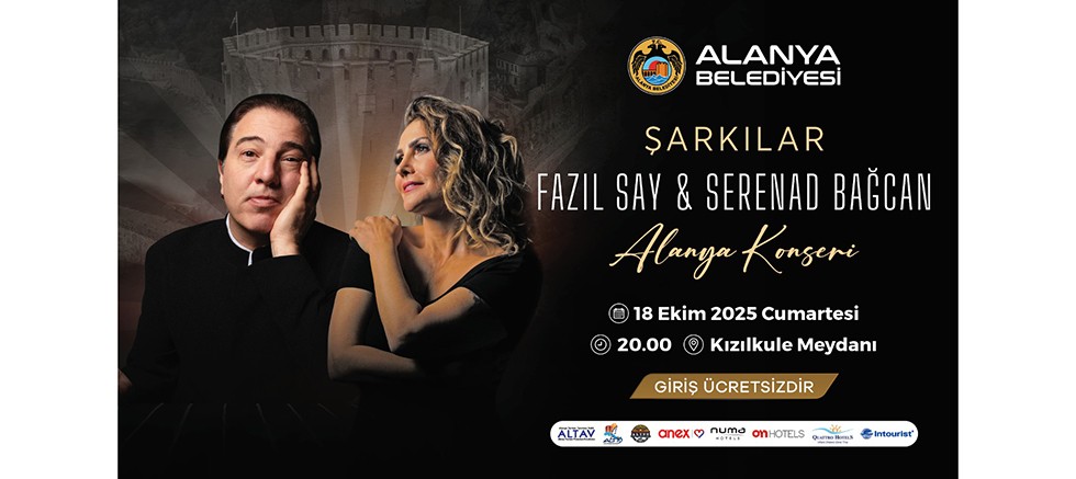 Alanya Belediyesi’nin ev sahipliğinde ücretsiz olarak düzenlenecek konser, 18 Ekim Cumartesi günü saat 20.00’de Kızılkule Meydanı’nda gerçekleştirilecek. Tarihi Kızılkule’nin görkemli atmosferi ve Akdeniz’in büyüleyici esintisi eşliğinde müzikseverler, sanat dolu bir geceye tanıklık edecek. Klasik müziğin evrensel diliyle duyguları birleştiren Fazıl Say ve yorum gücüyle dinleyicilerin kalbine dokunan Serenad Bağcan, Alanyalılara eşsiz bir müzik şöleni sunacak. Fazıl Say'ın, Nâzım Hikmet, Orhan Veli, Metin Altıok, Cemal Süreya gibi Türk şairlerinin eserlerinden esinlenerek bestelediği şarkılarını seslendirileceği özel gece ile ilgili Alanya Belediyesi’nden yapılan açıklamada, tüm vatandaşlar konsere davet edilerek şu ifadelere yer verildi: Kızılkule’nin tarihi dokusu ve Akdeniz’in esintisi eşliğinde, sanat ve müzik dolu bu unutulmaz gecede buluşalım.
