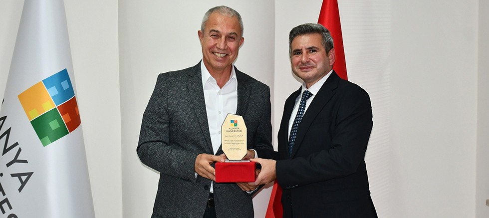 Kanuni mevzuat gereği Alanya Üniversitesi Mütevelli Heyeti Üyeliğinden ayrılan Alanya Belediye Başkanı Osman Tarık Özçelik'e, üniversitenin gelişimine sağladığı katkılardan dolayı Mütevelli Heyet Başkanlığı tarafından plaket takdim edildi.