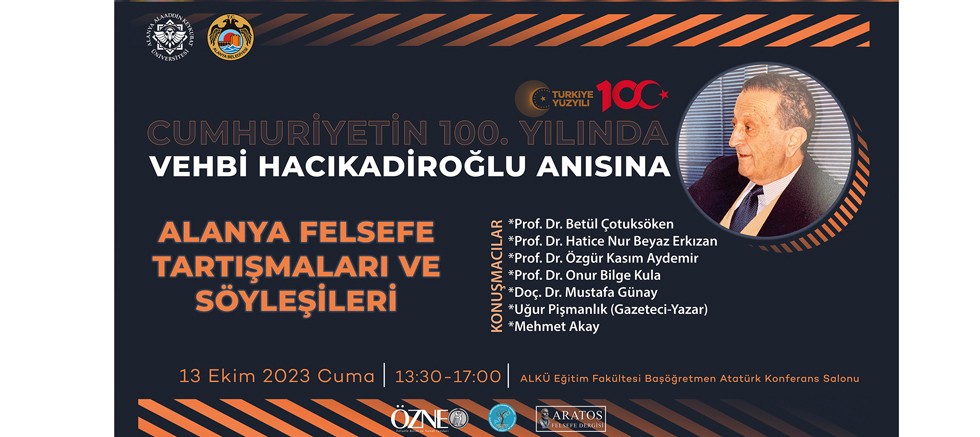Cumhuriyetin 100. Yılında Alanyalı Felsefeci Vehbi Hacıkadiroğlu anısına Alanya Alaaddin Keykubat Üniversitesinde (ALKÜ) düzenlenecek olan “Alanya Felsefe Tartışmaları ve Söyleşileri” programında birbirinden değerli akademisyen ve yazarlar katılacak.