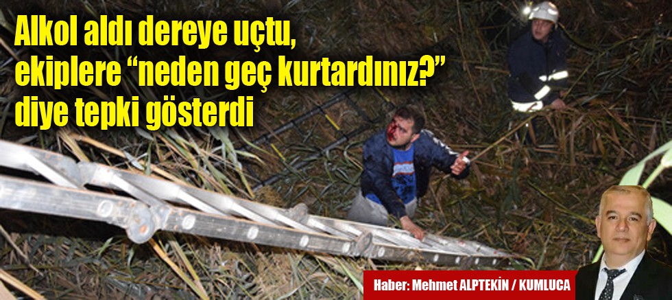 Kumluca’da, dün gece saat 23.45 te bir otomobilin Gâvur Deresine düştüğü ihbarı geldi. Olay yerine polis, itfaiye ve ambulans ekipleri sevk edildi. Olay yerine gelen polis ekipleri, Kum Mahallesi Obalar mevkiinde alkollü olduğu tespit edilen Ahmet Öner (33) adındaki bir vatandaşın, otomobiliyle dereye düştüğünü belirledi. Daha sonra, kaza yerine ambulans ve itfaiye ekipleri de geldi.