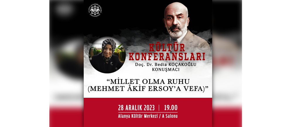 Vatanın bölünmez bütünlüğü, milletçe birlik ve beraberlik olma değerleri kapsamında sık sık konferans ve seminerler düzenleyen Alanya Alaadddin Keykubat Üniversitesi (ALKÜ), İstiklal Marşı’mızın yazarı millî şair Mehmet Âkif Ersoy’u anacak. Akdeniz Üniversitesi Öğretim Üyesi Doç. Dr. Bedia Koçakoğlu’nun konuşmacı olduğu “Millet Olma Ruhu (Mehmet Âkif Ersoy’a Vefa)” konulu konferans, 28 Aralık Perşembe günü Alanya Kültür Merkezi A Salonu’nda saat 19.00’da başlayacak.