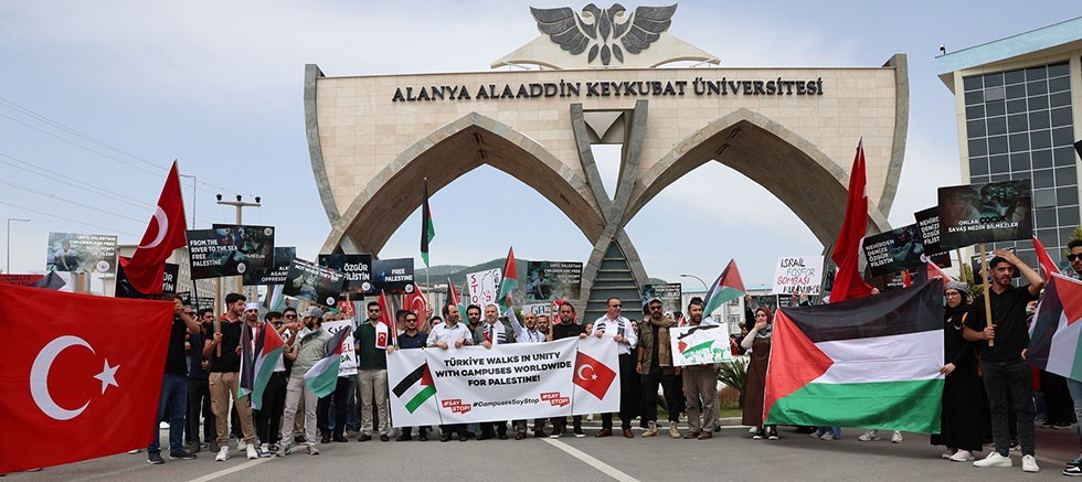 Alanya Alaaddin Keykubat Üniversitesinde (ALKÜ) öğrenciler ve personel, İsrail'in Gazze'ye yönelik saldırılarına tepki göstermek amacıyla “ALKÜ Filistin için Buluşuyor!” temalı yürüyüş düzenledi.