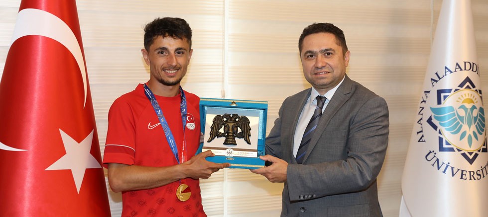 Alanya Alaaddin Keykubat Üniversitesi (ALKÜ) Rektörü Prof. Dr. Kenan Ahmet Türkdoğan, Çin'de düzenlenen 2023 Dünya Üniversiteler Yaz Oyunları 20 kilometre Erkekler Kategorisi Yürüyüş Finalinde ülkemize ilk altın madalya kazandıran ALKÜ öğrencisi ve Millî Sporcusu Salih Korkmaz’la buluşarak tebrik etti.