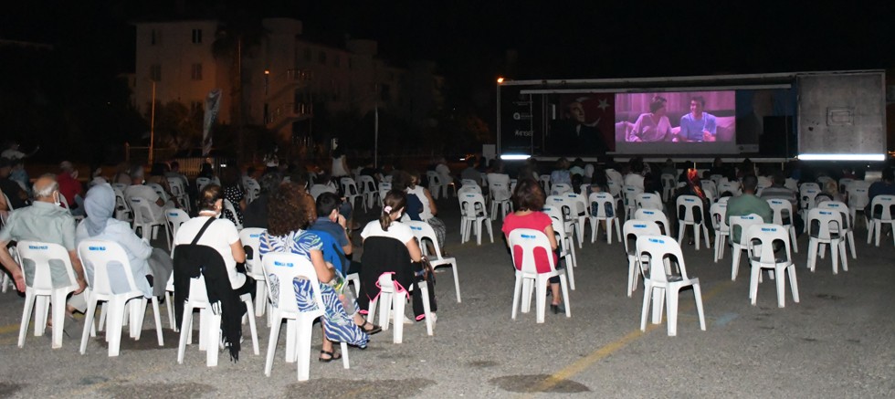 Sinema gösterimi, Kemer Belediyesinin destekleriyle pandemi kurallarına uyularak Kemer Ralli Alanında hazırlanan sandalyelerde sinema keyfi yaşadı.