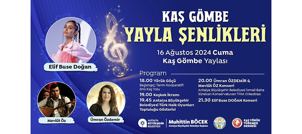 Kaş Gömbe Yayla Şenliği kapsamında Gömbe Yaylası’nda saat 19.45’te Antalya Büyükşehir Belediyesi Türk Halk Oyunları Topluluğu gösteri yapacak. Ümran Özdemir ve Mevlüt Öz Antalya Büyükşehir Belediyesi İsmail Baha Sürelsan Konservatuvarı Türk Halk Müziği Orkestrası eşliğinde birbirinden güzel şarkılarıyla müzik ziyafeti sunacak. Kaş Gömbe Yayla Şenliği, Türk Halk Müziğinin sevilen ismi Elif Buse Doğan konseri ile sona erecek. Doğan, sevilen türkülerini yayla şenliğine katılan vatandaşlar için seslendirecek. Gömbe Yayla Şenliğine tüm Antalyalılar davetli.