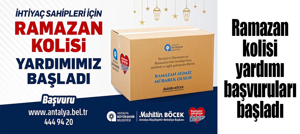 Antalya Büyükşehir Belediyesi, birlik, beraberliğin ve dayanışmanın öne çıktığı Ramazan Ayı’nda ihtiyaç sahibi aileleri yalnız bırakmıyor. İhtiyaç sahibi ailelere ulaştırılacak Ramazan Kolisi yardımı için başvurular başladı.