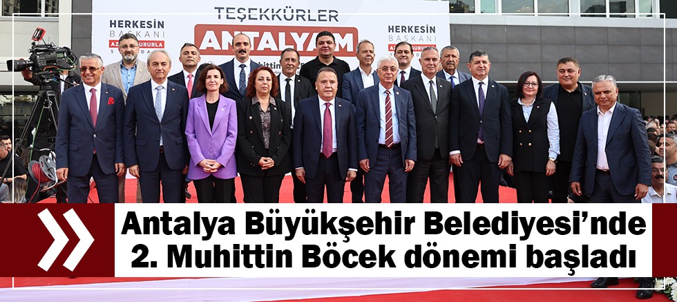 Antalya’da ikinci kez üst üste Büyükşehir Belediye Başkanı seçilerek bir ilke imza atan Muhittin Böcek için mazbatasını aldıktan sonra Büyükşehir Belediyesi önünde göreve başlama töreni düzenlendi. Törene CHP İl Başkanı Nail Kamacı, Parti Meclis Üyesi Şengül Yeşildal, Yüksek Disiplin Kurulu Üyesi Deniz Demiröz, CHP Antalya Milletvekilleri Aliye Coşar, Cavit Arı, Mustafa Erdem, Sururi Çorabatır, CHP İlçe Belediye Başkanları, CHP İlçe Başkanları ve çok sayıda vatandaş ile belediye personeli katıldı. Alanı dolduran vatandaşlar ellerinde Türk Bayrakları ile büyük coşku yaşadı. Vatandaşların sevgi gösterileriyle karşıladığı Böcek, ‘Herkesin Başkanı’ sloganları ile alkışlar eşliğinde Antalyalıları selamladı.