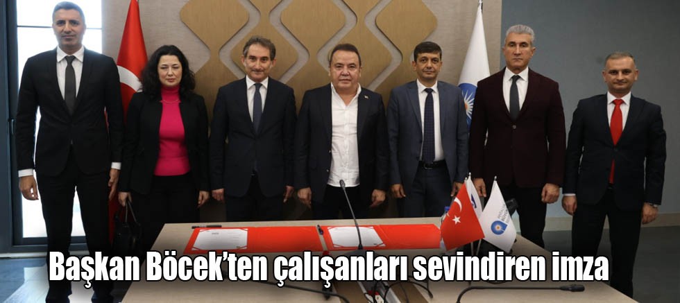 Başkan Muhittin Böcek ve banka yetkilileri memur, sözleşmeli ve kadrolu işçilerin 3 yıllık maaş ödemesi için 30 bin TL’lik imzayı attı. Promosyon ihalesinden 2 bin 170 personel faydalanacak.