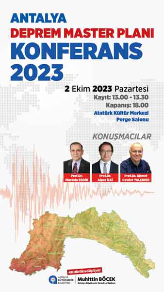 Prof. Dr. Mustafa Erdik, Prof. Dr. Alper İlki, Prof. Dr. Ahmet Cevdet Yalçıner’in konuşmacı olarak katılacağı konferansta deprem riski ve deprem öncesinde yapılması gerekenler ve Akdeniz'de tsunami konuları ele alınacak. Konferansta gündeme gelecek konular Antalya Büyükşehir Belediyesi tarafından 2022 yılından bu yana çalışmaları sürdürülen Deprem Master Planı’nın hazırlık çalışmalarına da katkı sunacak.