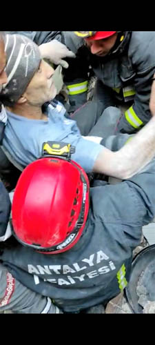 Antalya Büyükşehir Belediyesi İtfaiyesi, Hatay’da depremin 57’nci saatinde 50 yaşındaki Muhammet Seyit’i enkazdan sağ olarak çıkardı.