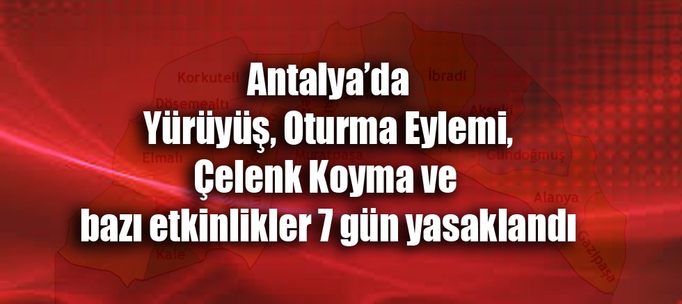 Antalya Valiliği tarafından yapılan açıklamaya göre Antalya’da 7 gün süreyle yürüyüş, oturma eylemi, stant/çadır kurma, çelenk koyma, barış zincirinin yasaklandığı basın duyurusu ile bildirildi. Açıklamada şöyle denildi: