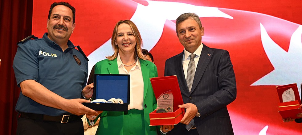 Konuşmasının ardından Vali Şahin İl Emniyet Müdürü İlker Arslan ile birlikte Panelde sunum yapan Melek Bal Ertuğrul, Oktay Ertuğrul ve Umut Akyürek'e plaket takdim etti.