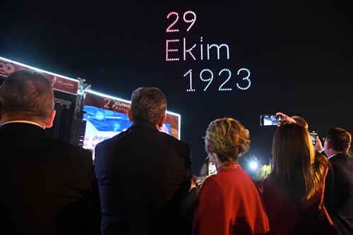 Resepsiyonun ardından Vali Hulusi Şahin ve eşi Ebru Şahin, Cumhuriyet Meydanı semalarında 500 drone ve havai fişek gösterisiyle gerçekleşen görsel şöleni on binlerce Antalyalı ile birlikte ayakta alkışlayarak izledi.