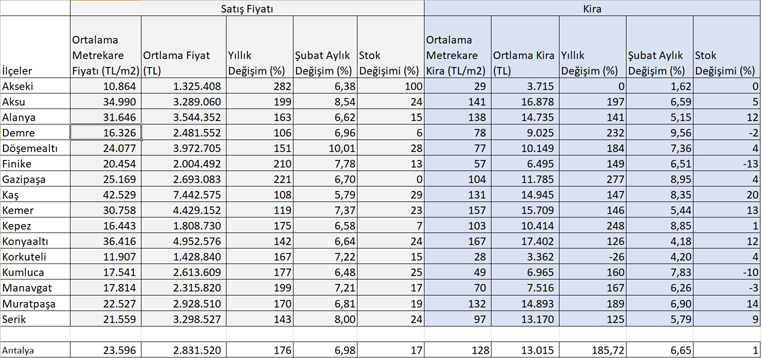 Antalya’da Şubat ayında satılık konut stoku %17 artarken, kiralık konut stoku %1 artış gösterdi, ortalama kira 13 bin 15 TL, ortalama satış fiyatı ise 2 milyon 831 bin 520 TL oldu. Antalya’da kiralık konut stokunun en fazla düşüş gösterdiği ilçeler Finike ve Kumluca oldu.