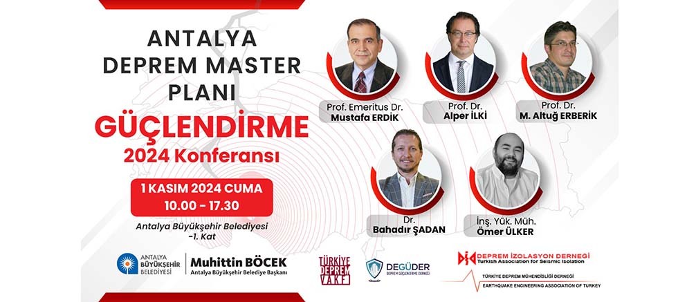 Deprem Master Planı çalışmaları sürecinde ilgili tüm kurum ve kuruluşların bilgilendirilmesi ve vatandaşın bilinçlendirilmesi için her sene yapılmakta olan çalıştay programının 2024 yılı teknik etkinliği kapsamında, planın ana hedeflerinden biri olan “mevcut yapıların güçlendirilebilir olanlarının tespit edilerek yenilenmesi”nin irdeleneceği bir konferans düzenlenecek. Türkiye Deprem Vakfı, Türkiye Deprem Mühendisleri Derneği, Deprem İzolasyon Derneği ile Deprem Güçlendirme Derneği (DEGÜDER) tarafından desteklenen “Antalya Deprem Master Planı-Güçlendirme Konferansı” 1 Kasım Cuma günü saat 10.00’da Antalya Büyükşehir Belediyesi Hizmet Binası’nda bulunan Nikah Salonu’nda düzenlenecek. Konferansa Prof. Emeritus, Dr. Mustafa Erdik, Prof. Dr. Alper İlki, Prof. Dr. M. Altuğ Erberik, Dr. Bahadır Şadan, İnş. Yük. Müh. Ömer Ülker konuşmalarıyla katkı sağlayacak.