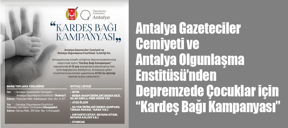 Merkezi Kahramanmaraş olan ve 10 ilde ağır yıkıma neden olan Cumhuriyet tarihinin en büyük deprem felaketinin ardından Antalya'mızda misafir ettiğimiz depremzede çocuklarımıza ulaştırmak üzere Antalya Gazeteciler Cemiyeti ve Antalya Olgunlaşma Enstitüsü iş birliği ile "Kardeş Bağı" yardım kampanyası başlatıldı.