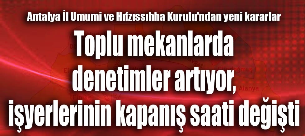 Antalya İl Umumi ve Hıfzıssıhha Kurulu'ndan Koronavirüs salgınından korumak ve yayılmasını engellemek için alınması gereken tedbirler kapsamında, il genelinde işyerlerinin kapanış saatini 22.00 olarak belirlendi.