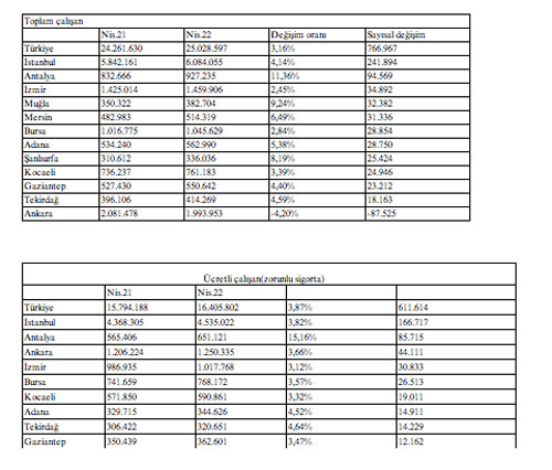 SGK’ya kayıtlı toplam çalışan (işveren, esnaf, ücretli çalışan ve memur) sayısı Nisan 2022 itibariyle Türkiye genelinde %3,16 artmış, 766 bin istihdam artışının 241 bini İstanbul, 94 bini Antalya tarafından gerçekleştirilmiştir. Antalya artış oranında birinci, mutlak değişimde ikinci sırada yer almıştır. Ankara’da toplam kayıtlı istihdamda azalma olmuştur.