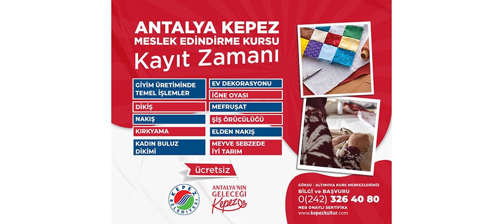 Antalya Kepez Meslek Edindirme Kursları, bu yıl da el sanatlarından teknolojiye, güzellik ve bakım hizmetlerinden dil eğitimlerine kadar geniş bir yelpazede kurs programı düzenleyecek. Vatandaşların kişisel gelişimlerini desteklemeyi ve mesleki eğitimlerle istihdama nitelikli iş gücü kazandırmayı hedefleyen kurslar için yeni dönem kayıtları başladı. Her yıl yüzlerce kişiye ücretsiz mesleki eğitim imkanı sunan Kepez Meslek Edindirme Kursları’na 15 yaş ve üzeri herkes başvuru yapabiliyor. Eğitimlerini başarıyla tamamlayan kursiyerler, Milli Eğitim Bakanlığı(MEB) onaylı sertifika almaya hak kazanacak. Sertifikalar, kursiyerlerin hem kendi işlerini kurmaları hem de farklı sektörlerde iş bulmaları açısından büyük avantaj sağlayacak. Yeni dönemde; Giyim üretiminde temel işlemler, dikiş, nakış, kırkyama, kadın bluz dikimi, ev dekorasyonu, iğne oyası, mefruşat, şiş örücülüğü, elden nakış, meyve-sebze üretiminde iyi tarım uygulamaları, Bilgisayar işletmenliği, ofis programları kullanımı, saça geçici kalıcı şekil verme, makyaj uygulama teknikleri, protez tırnak ve tırnak süsleme gibi branşlar yer alıyor. Başvuru yapmak ve detaylı bilgi almak isteyen vatandaşlar, (0242) 326 40 80 numaralı telefondan gerekli bilgilere ulaşabilecekler.