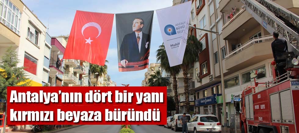 bulvar, cadde ve sokakları bayraklarla donatıldı. Büyükşehir Belediyesi’nin çalışmalarıyla Antalya’nın dört bir yanı 23 Nisan Ulusal Egemenlik ve Çocuk Bayramı coşkusuna yakışır şekilde kırmızı beyaza büründü.