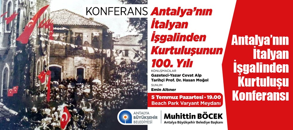 Büyükşehir Belediyesi Kültür ve Sosyal İşler Daire Başkanlığı tarafından Konyaaltı Beach Park Varyant Meydanı’nda 5 Temmuz Pazartesi günü saat 19.00’da düzenlenecek İtalyan İşgalinden Kurtuluşunun 100. Yılı Konferansı’na Tarihçi Prof. Dr. Hasan Moğol, Gazeteci-Yazar Cevat Alp konuşmacı olarak katılacak. Konferansta Araştırmacı-Yazan Emin Altıner de işgal dönemini anlatan bir sunum gerçekleştirecek. Konferansa tüm Antalyalılar davetli.