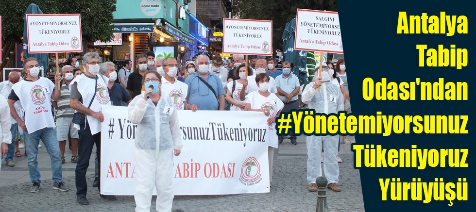 #YönetemiyorsunuzTükeniyoruz Haftası etkinlikleri kapsamında Antalya Tabip Odası Yönetim Kurulu üyeleri ellerinde dövizler ile üç farklı güzergahtan Attalos meydanına yürüdüler. Meydana ulaştıklarında meslektaşları, demokratik kitle örgütleri ve sendikalar tarafından alkışlarla karşılandılar. Antalya Tabip Odası başkanı Prof. Dr. Nursel Şahin salgının yönetilemediğine, COVID-19 kaynaklı ölümlere ve artan hasta sayısına dikkat çekti. Ardından Tabip Odası Genel sekreteri Dr. Gülsün Gülay Yılmaz #YönetemiyorsunuzTükeniyoruz başlıklı basın açıklamasını okudu. Kalabalık bir katılım ile gerçekleştirilen eylem hafta boyunca diğer etkinliklerle devam edecek. Bir hafta boyunca “siyah kurdele” veya ‘siyah rozet’ takarak çalışacak olan doktorlar, 17 Eylül Perşembe günü saat: 12.30’da hastaneler ve bütün sağlık kurumlarında yitirilen hekimler ve sağlık çalışanlarının anısına 1 dakikalık saygı duruşunda bulunacaklar. Antalya Tabip Odası Yönetim Kurulu Üyeleri de Antalya Eğitim Araştırma Hastanesi önündeki saygı duruşu etkinliğine katılacaklar.