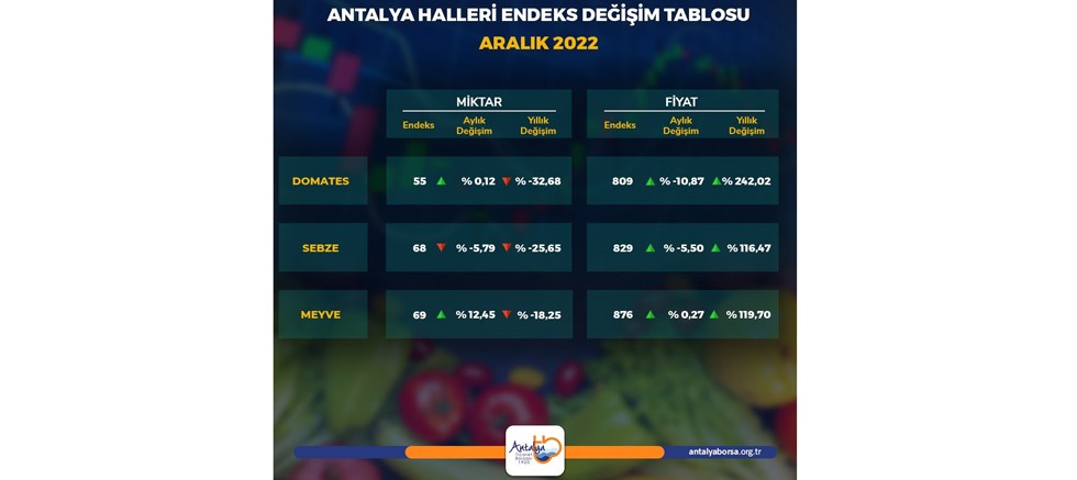 Antalya hallerinde işlem gören domates, sebze ve meyvelerin işlem miktar ve fiyatlarıyla ilgili endeks değerleri, 2022 Aralık ayında bir önceki aya göre ve geçen yılın aynı ayına göre aşağıdaki tablodaki gibi değişti: