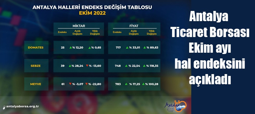 Antalya hallerinde işlem gören domates, sebze ve meyvelerin işlem miktar ve fiyatlarıyla ilgili endeks değerleri, 2022 Ekim ayında bir önceki aya göre ve geçen yılın aynı ayına göre aşağıdaki tablodaki gibi değişti: