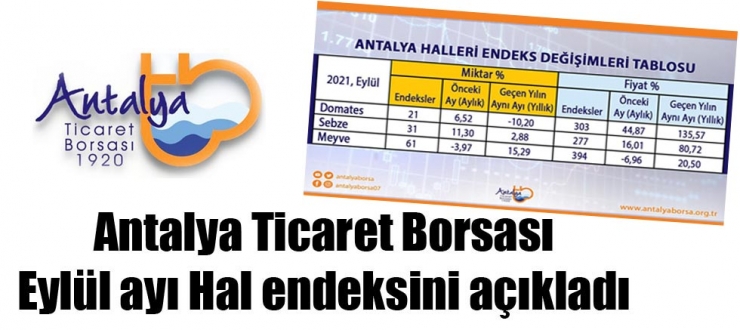 Antalya Ticaret Borsası (ATB) Eylül ayı Antalya Halleri Domates, Sebze ve Meyve Endeksini açıkladı. Antalya hallerinde işlem gören domates, sebze ve meyvelerin işlem miktar ve fiyatlarıyla ilgili endeks değerleri, 2021 Eylül ayında bir önceki aya göre ve geçen yılın aynı ayına göre aşağıda verilen tablodaki gibi değişti: