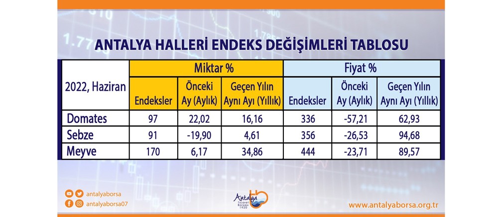 Antalya Ticaret Borsası (ATB), Haziran ayı Antalya Halleri Domates, Sebze ve Meyve Endeksini açıkladı. Antalya hallerinde işlem gören domates, sebze ve meyvelerin işlem miktar ve fiyatlarıyla ilgili endeks değerlerinin değişimleri, 2022 Haziran ayında bir önceki aya göre ve geçen yılın aynı ayına göre aşağıdaki tablodaki gibi değişti: