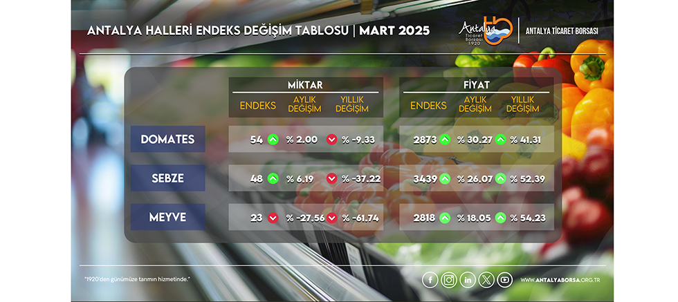 Antalya hallerinde işlem gören domates, sebze ve meyvelerin işlem miktar ve fiyatlarıyla ilgili endeks değerleri, 2025 Mart ayında bir önceki aya göre ve geçen yılın aynı ayına göre aşağıda verilen tablodaki gibi değişti: