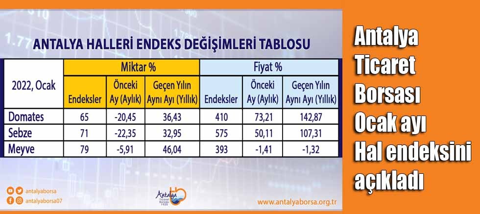 Antalya hallerinde işlem gören meyvenin 2022 yılı Ocak ayı endeks değişimleri, miktarda ve fiyatta son 4 yılın ortalamasında seyretti.